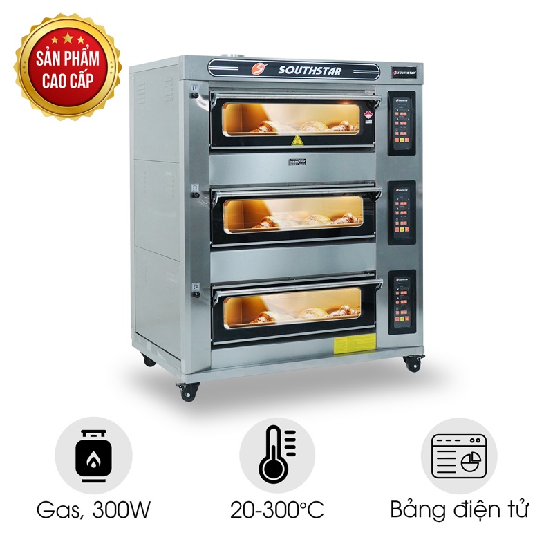 Lò nướng Southstar gas 3 tầng 6 khay YXY-60AI (bảng điện tử) là thiết bị cao cấp sở hữu nhiều ưu điểm vượt trội hơn dòng phổ thông trước đây. Sản phẩm được sử dụng rộng rãi không chỉ bởi vẻ ngoài hiện đại, mà còn ở hiệu suất nướng tốt, gia nhiệt mạnh mẽ và duy trì ổn định, tiết kiệm nhiên liệu, kết hợp cùng hệ thống điều khiển điện tử chính xác cao, cho ra lò những mẻ bánh thơm ngon, chuẩn hương vị. Thiết bị có thể nướng được hầu hết các loại bánh ngọt, bánh bông lan, bánh mì, pizza, bánh trung thu,…